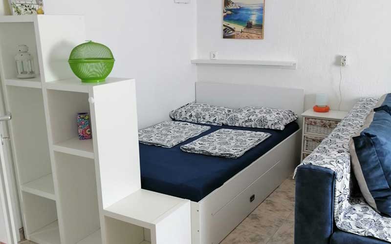 Apartma Unije 11. nadstropjePrijeten in svetel apartma, idealen za pare ali manjšo družino. Na 30 m² ponuja udobno bivanje z zakonsko posteljo in kavčem, klimo, Wi-Fi ter popolnoma opremljeno kuhinjo s pomivalnim strojem. Pred vhodom vas čaka majhna mizica z dvema stoloma za jutranjo kavo.